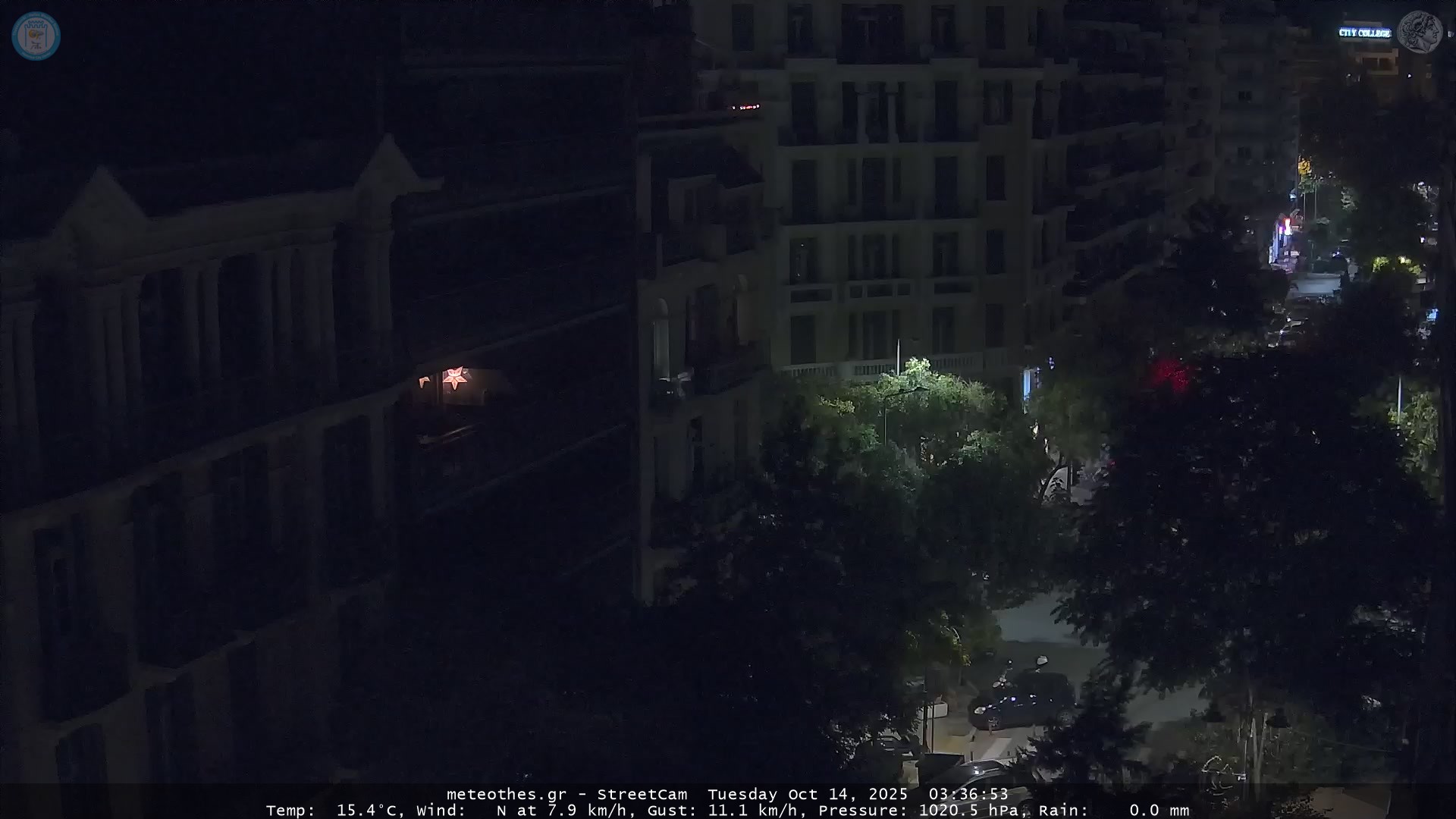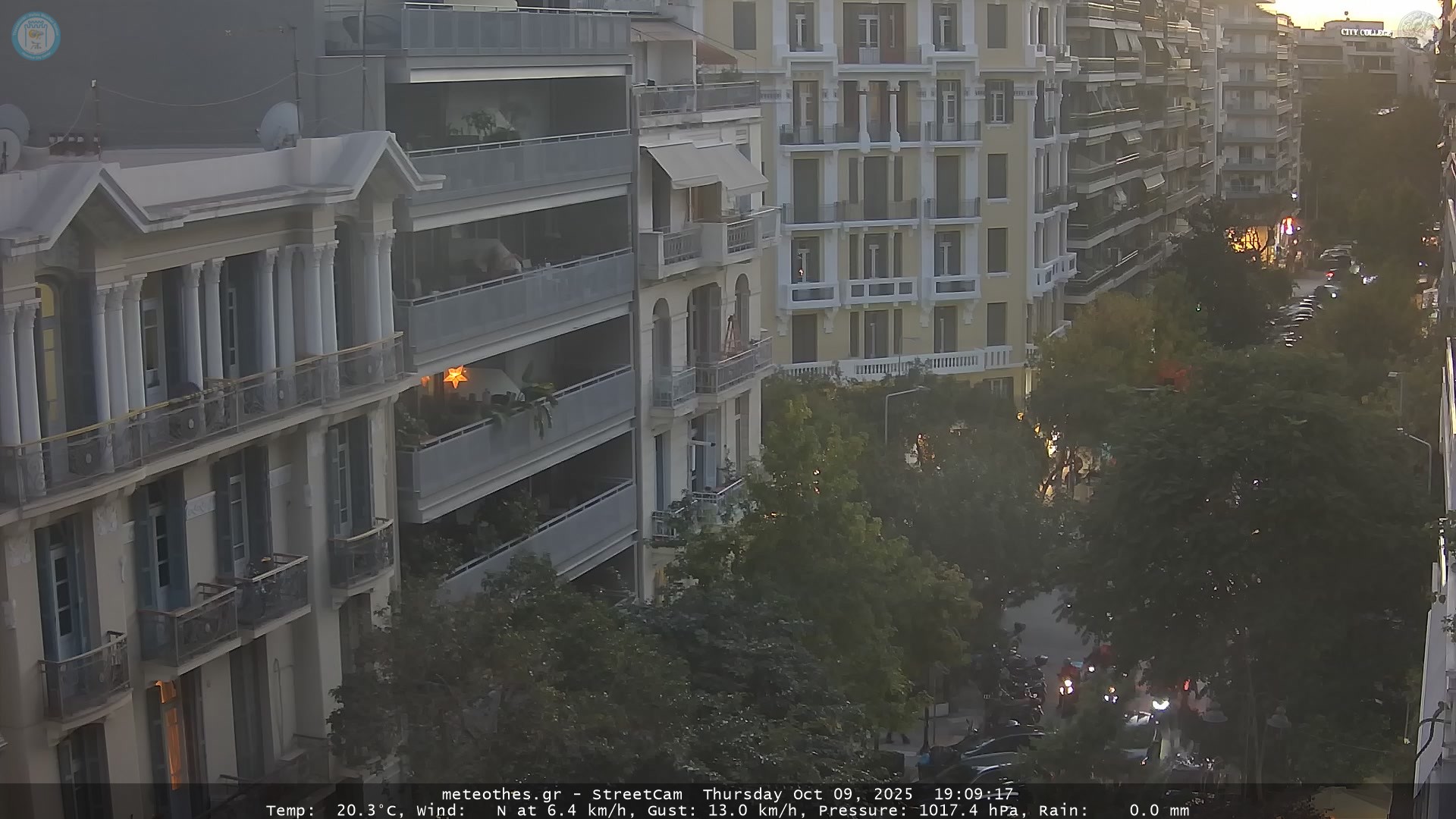 Η κάμερα αυτή, αποτελεί μέρος του Μετεωρολογικού Σταθμού στο Ιστορικό κέντρο της Θεσσαλονίκης. Θέα προς Ν-ΝΔ. Αυτόματη ανανέωση κάθε 20 δευτερόλεπτα. Δείχνει: ΝΔ μέρος της Π.Π. Γερμανού, που διασταυρώνεται με τίς οδούς Παύλου Μελά, Τσιμισκή, Μητροπόλεως, Κόυσκουρα και καταλήγει στη Λεωφόρο Νίκης δίπλα στη θάλασσα. |